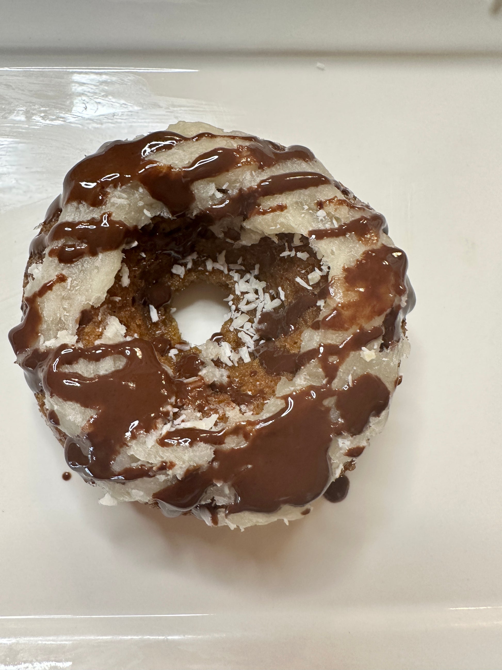 Ingredients: Almond flour, eggs, coconut sugar, coconut milk, apple cider vinegar, vanilla, sea salt. Topped with dark chocolate drizzle.